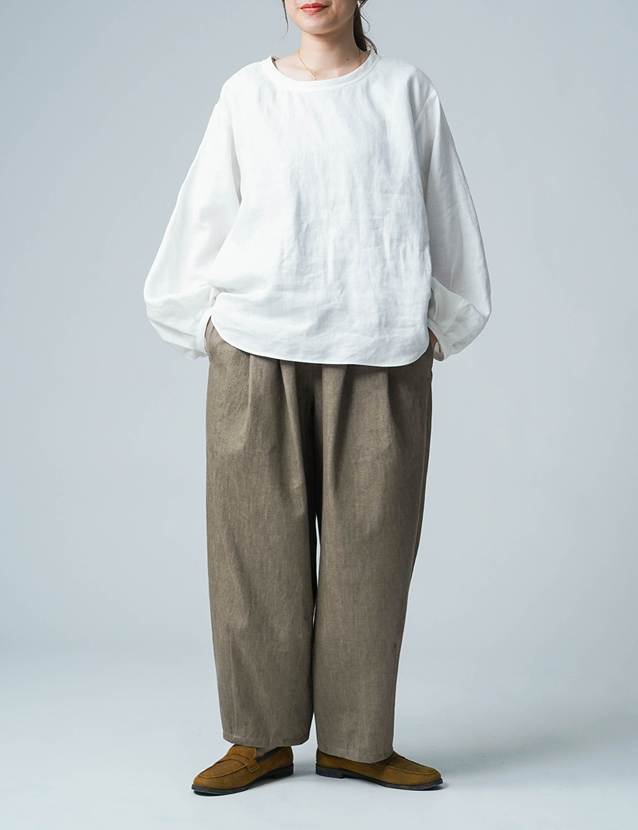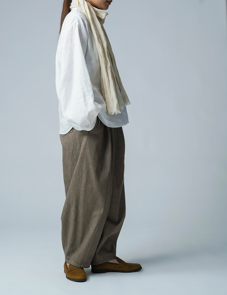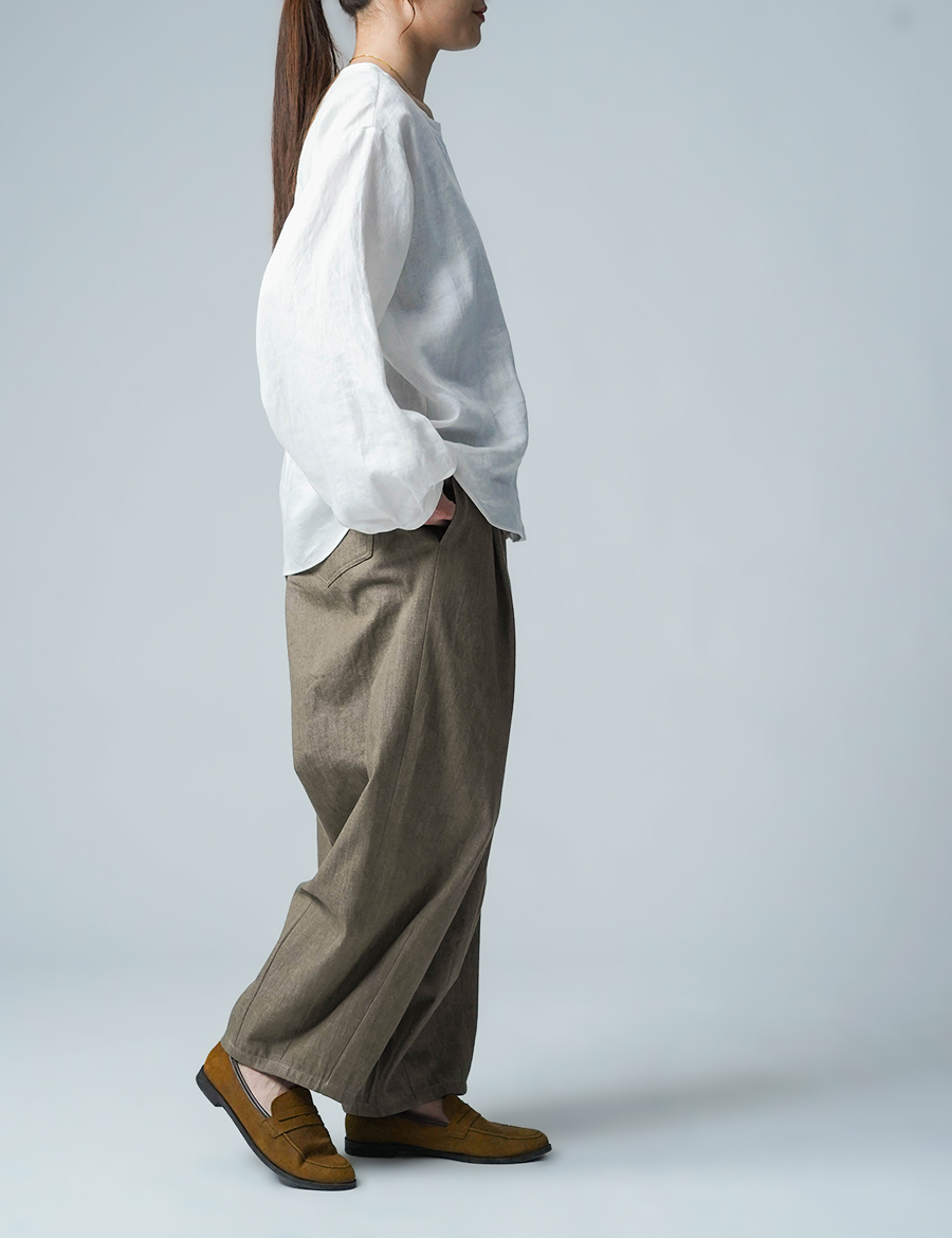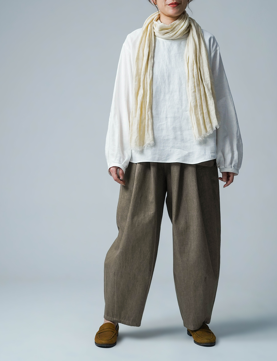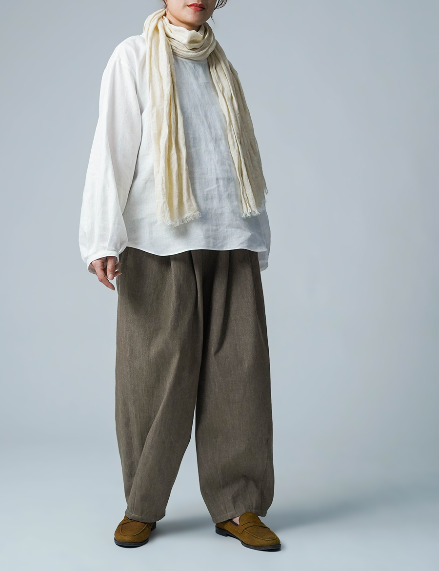 ほどよいボリュームと、落ち着いたシルエット。バルーンの丸みはありつつも、タックが広がりを抑え、穿くとすっきりと整います。ウエストは細めのゴム仕様で、締め付け感が少なく、ゆったりリラックスした穿き心地。ベルトループ付きのため、細めのベルトを合わせたいです。靴を履かずに穿くと、床にちょうどつくほどの長さです。