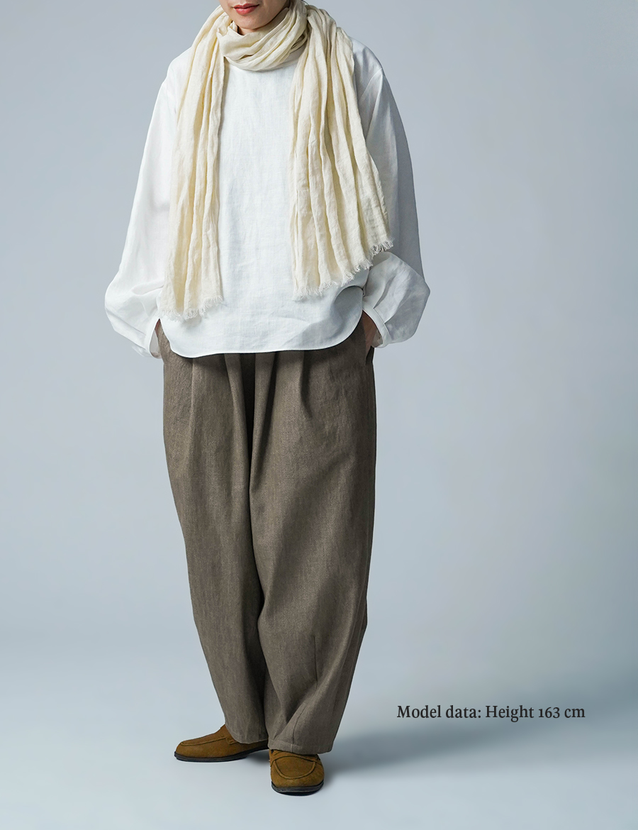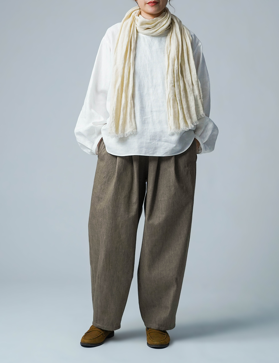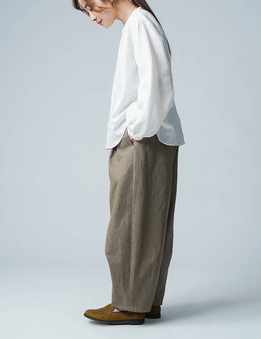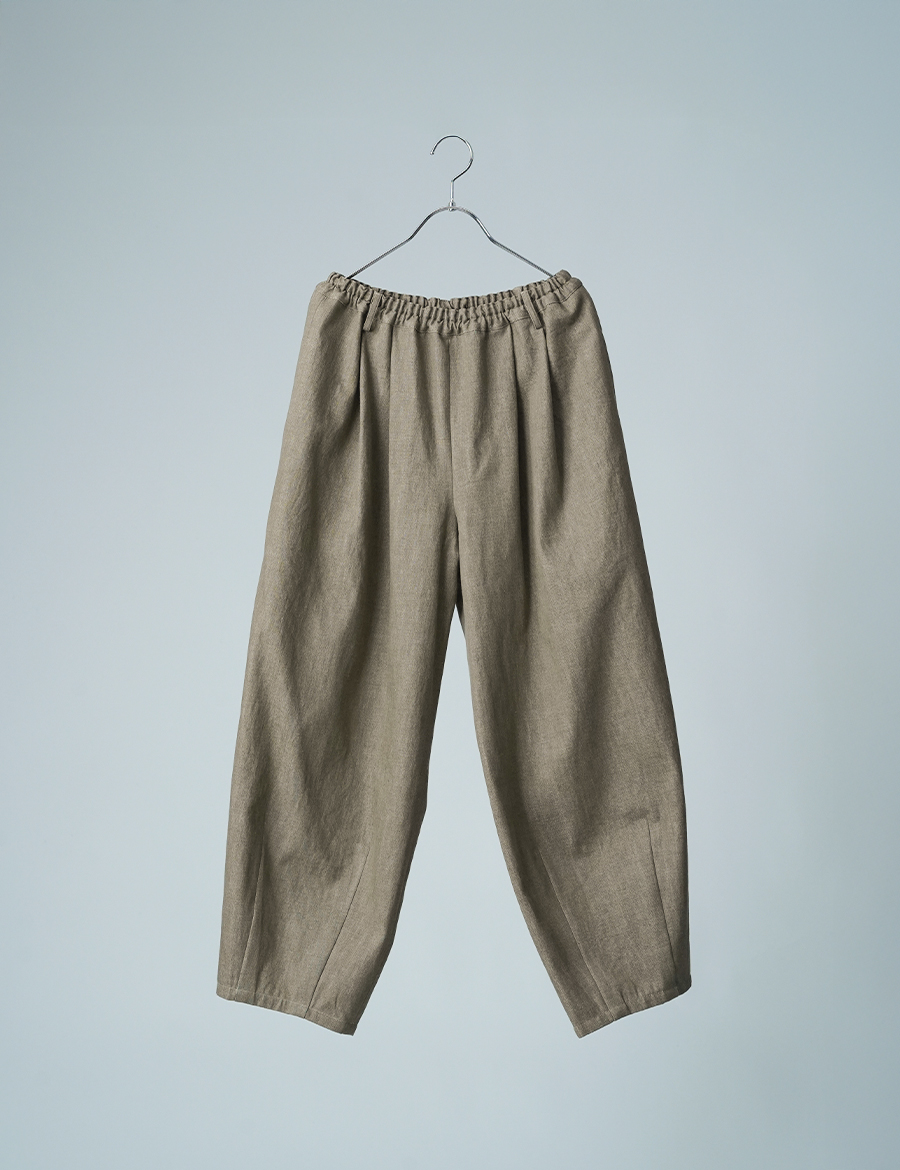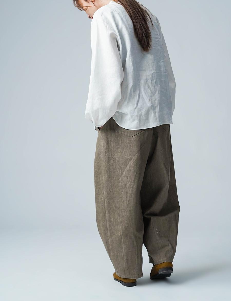 ほどよいボリュームと、落ち着いたシルエット。バルーンの丸みはありつつも、タックが広がりを抑え、穿くとすっきりと整います。ウエストは細めのゴム仕様で、締め付け感が少なく、ゆったりリラックスした穿き心地。ベルトループ付きのため、細めのベルトを合わせたいです。靴を履かずに穿くと、床にちょうどつくほどの長さです。