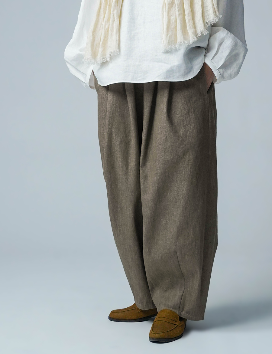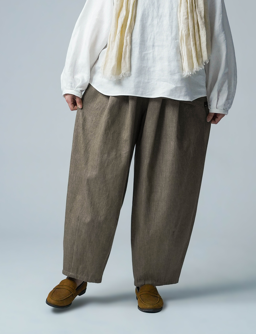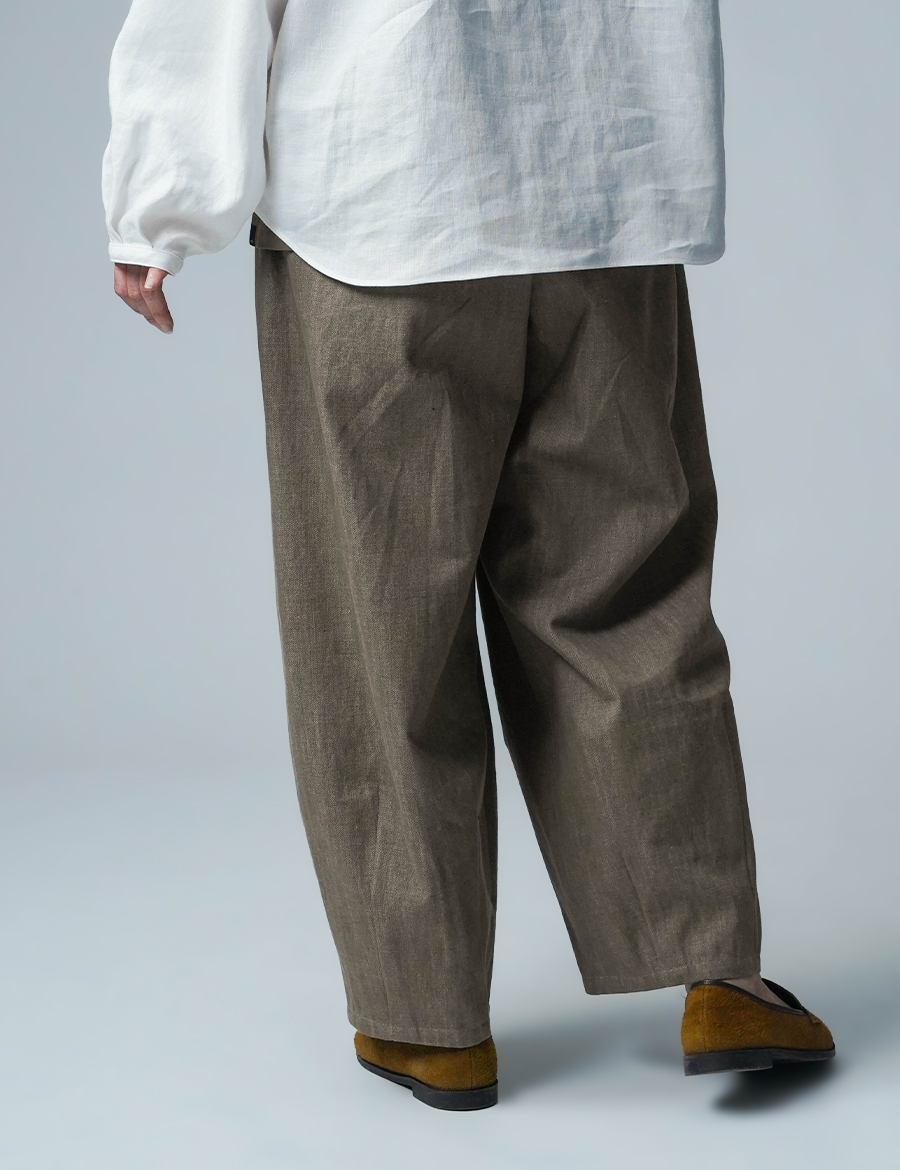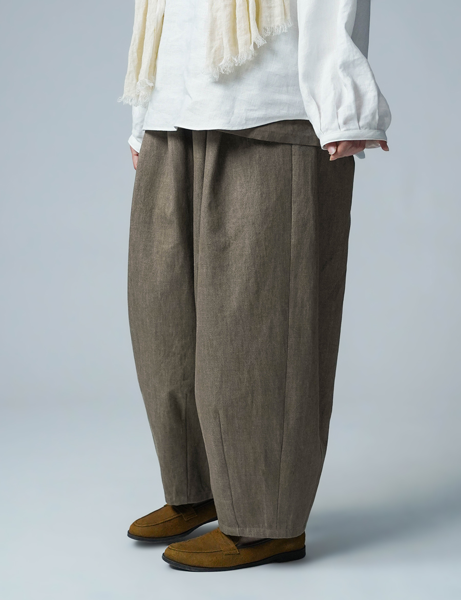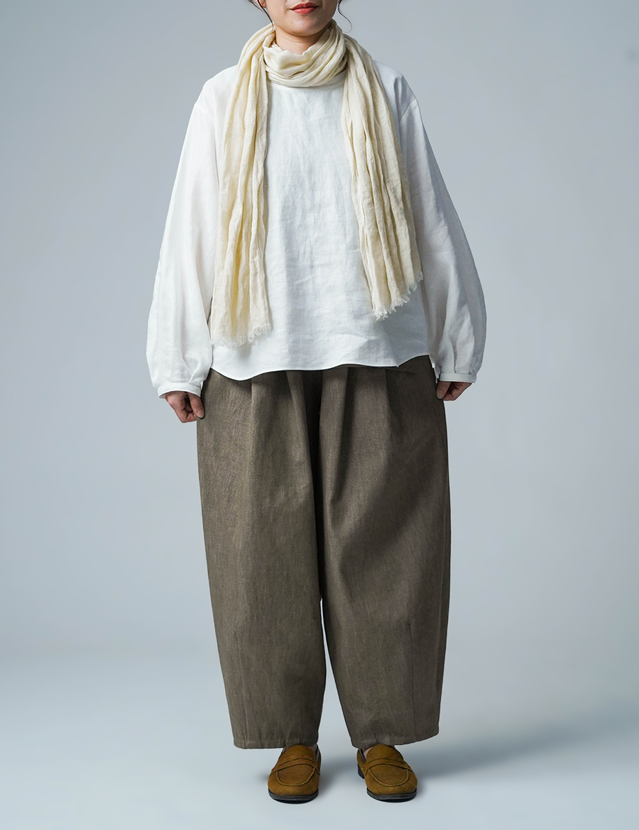 ほどよいボリュームと、落ち着いたシルエット。バルーンの丸みはありつつも、タックが広がりを抑え、穿くとすっきりと整います。ウエストは細めのゴム仕様で、締め付け感が少なく、ゆったりリラックスした穿き心地。ベルトループ付きのため、細めのベルトを合わせたいです。靴を履かずに穿くと、床にちょうどつくほどの長さです。