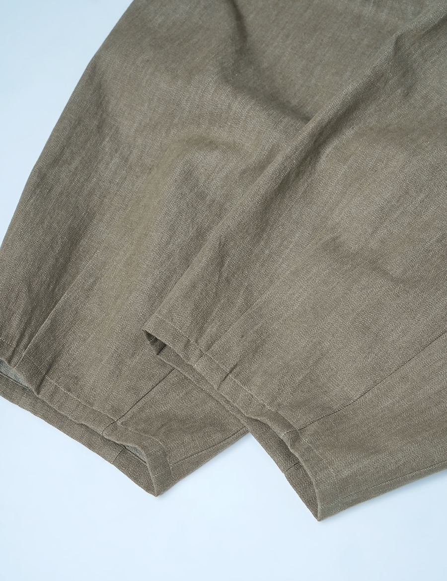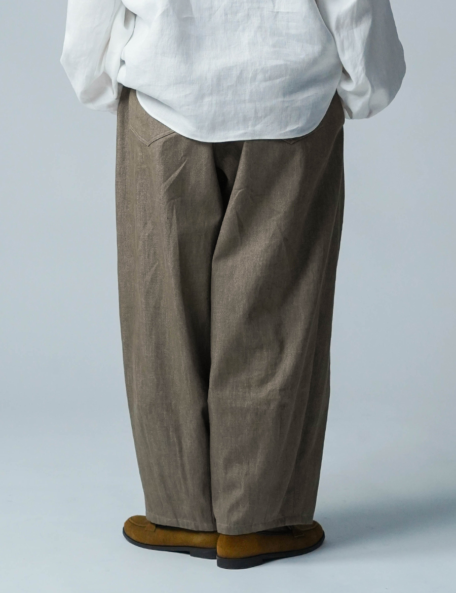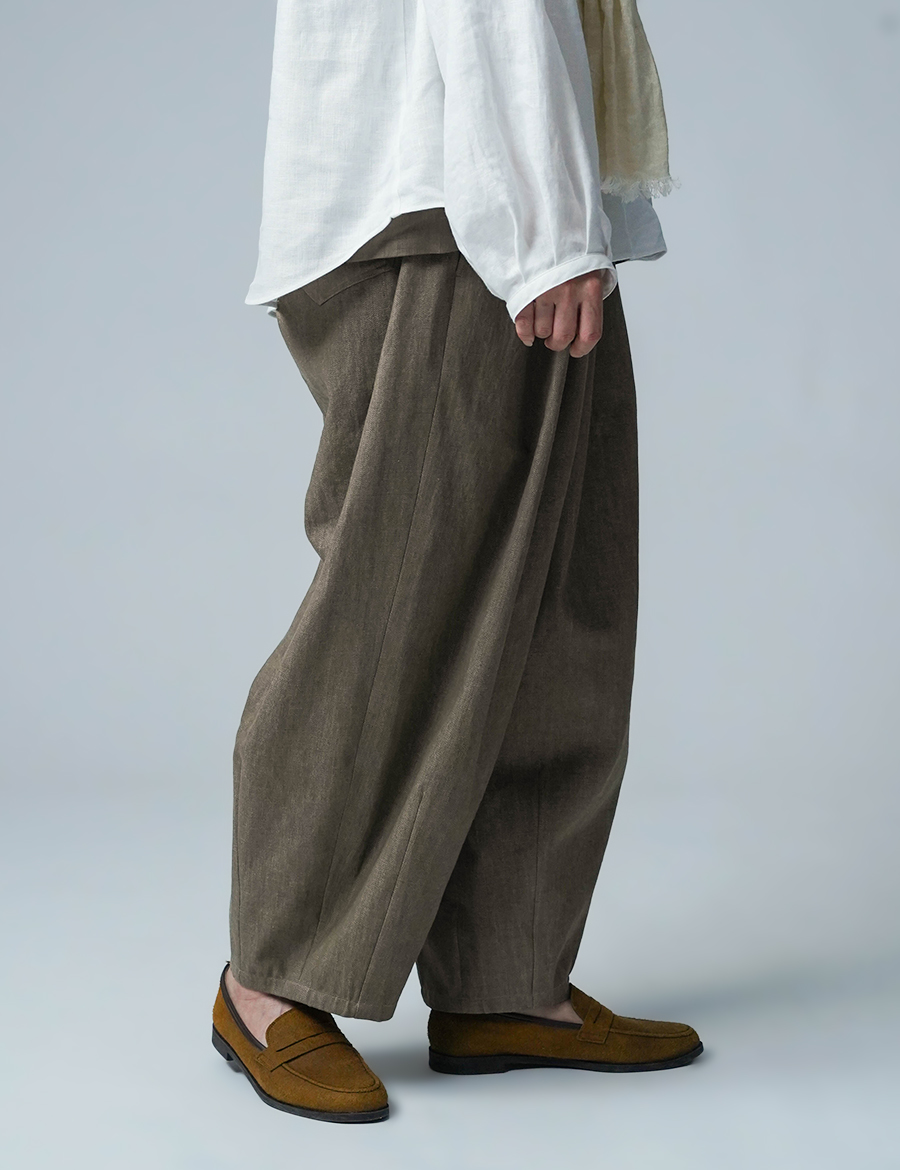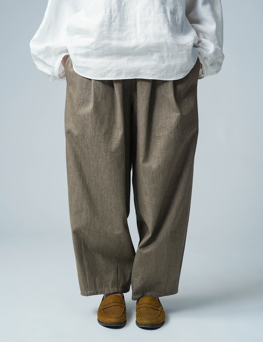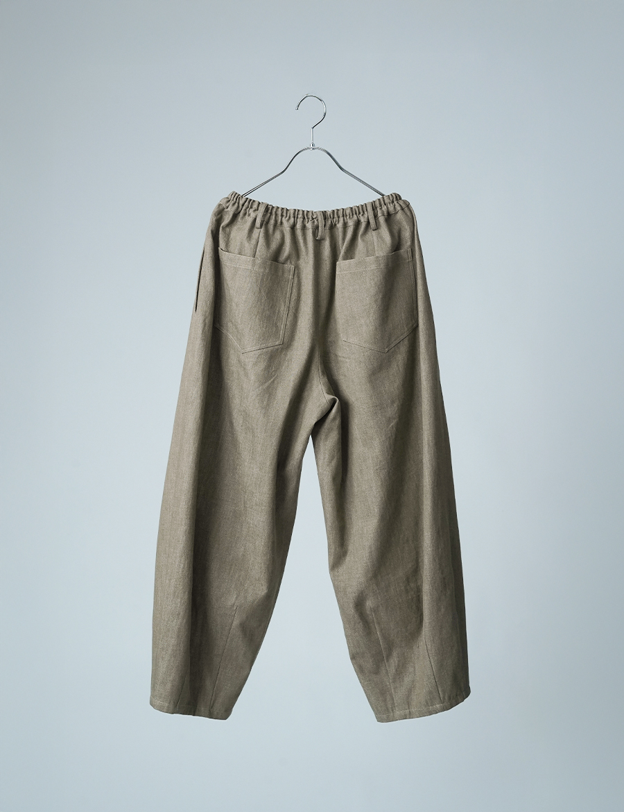 ほどよいボリュームと、落ち着いたシルエット。バルーンの丸みはありつつも、タックが広がりを抑え、穿くとすっきりと整います。ウエストは細めのゴム仕様で、締め付け感が少なく、ゆったりリラックスした穿き心地。ベルトループ付きのため、細めのベルトを合わせたいです。靴を履かずに穿くと、床にちょうどつくほどの長さです。