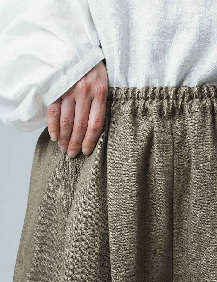 腰まわりからゆったりと分量を取りながら、裾に向かって自然に収まることで、