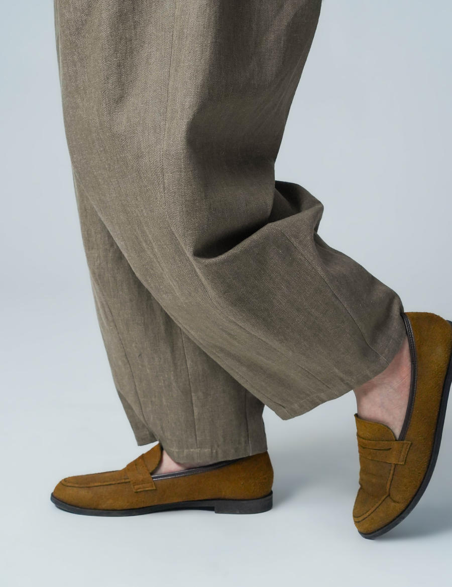 足にまとわりつく部分がまったくなく、とても快適です。このゆとりなら、真夏でもかなり心地よく過ごせると思います。腰まわりはすっきりとしていて、裾にかけてほどよくボリュームが出る印象で、さまざまなコーデが楽しめそうです。サンダルや革靴にも合わせやすく、足元の変化で表情が変わるパンツです。着丈は足の甲にかかるくらいで、ウエストもちょうどよいです。